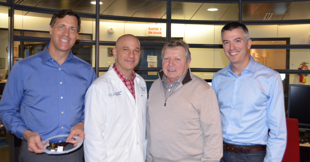 De gauche à droite : Martin Brouillette, professeur titulaire en ingénérie mécanique, Université de Sherbrooke; Dr Andrew Benko, radiologiste, Hôpital Fleurimont du CIUSSS de l'Estrie - CHUS; M. Jean-Claude Bergeron, patient; le Dr Simon Bérubé, cardiologue, Hôpital Fleurimont du CIUSSS de l'Estrie - CHUS.- Fichiers complémentaires