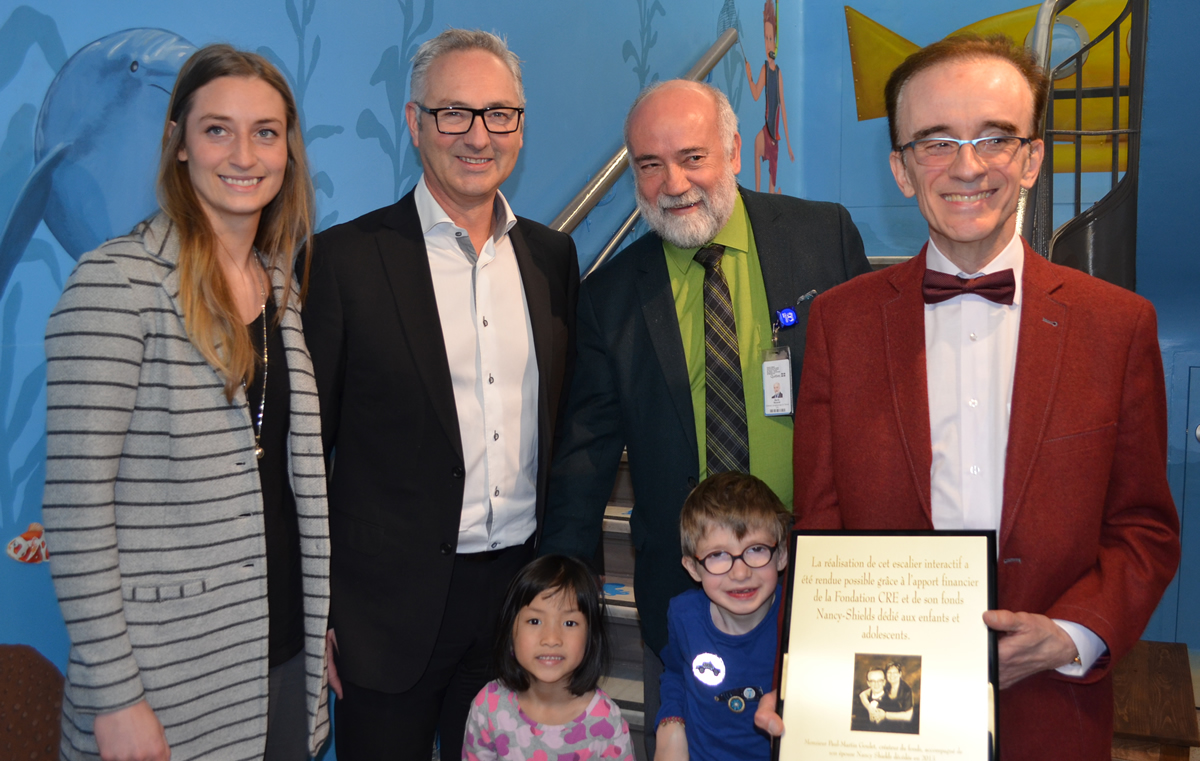 « Nous désirions aménager l’escalier pour en faire un espace ludique et coloré qui favorise les thérapies par le jeu. Les objectifs en réadaptation sont souvent exigeants pour nos jeunes usagers et c’est pourquoi il fallait que cet endroit soit un lieu accueillant, agréable et stimulant! » a indiqué Cynthia Fontaine, physiothérapeute impliquée de près dans la réalisation du projet.Destiné aux enfants et adolescents, ce monde marin est installé au Centre de réadaptation Estrie (CRE) situé sur la rue King Est à Sherbrooke. C’est grâce au soutien financier de 6 000 $ de la Fondation CRE et de 20 000 $ de son Fonds Nancy-Shields que la concrétisation de ce projet a été rendue possible.